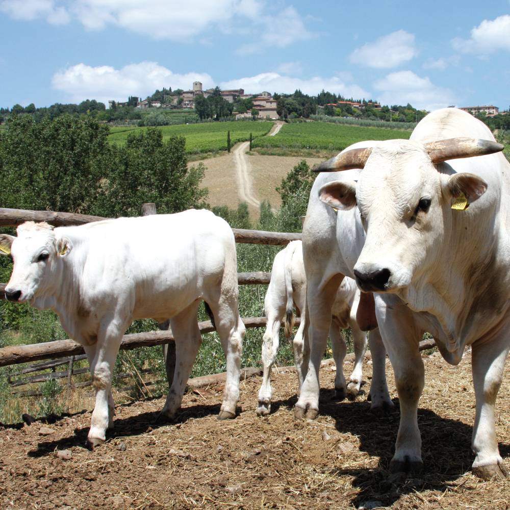 Chianina Rinder sind mit durchschnittlich 180 cm die weltweit größten Fleischrinder. Kennzeichnend für das Chianina Rind ist das zunächst bei der Geburt rötlich-braune Fell, das bei einem ausgewachsenen Tier in eine porzellanweiße Färbung übergeht. Das Fleisch des Chianina Rinds, das gutgereift seinen vollen Geschmack entfaltet, dient als essenzielle Grundlage für die bekanntesten Fleischgerichte der Toskana.