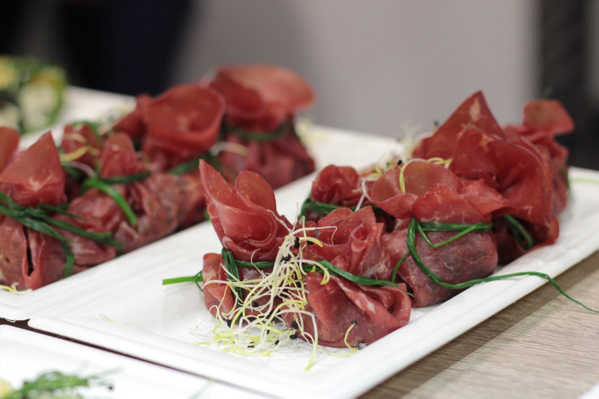 Sind Sie auf der Suche nach einem leckeren kulinarischen Mitbringsel für eine Geburtstags- oder Familienfeier? Dieses Bresaola-Rezept der Kochschule Berlin kann wunderbar vorbereitet und einfach transportiert werden. Die mit Tomaten, Pistazien und Parmesan gefüllten Säckchen werden mit einem Schnittlauchhalm ansehnlich verschnürt.