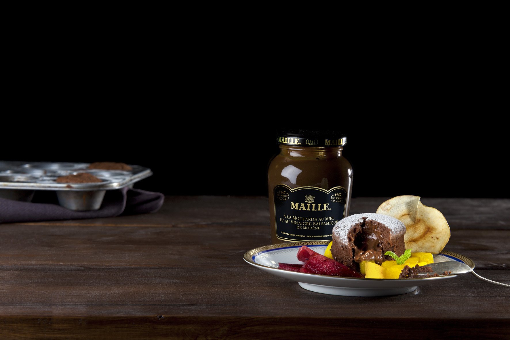 Geschmolzene Schokolade und Eigelb-Senfgemisch vorsichtig in die steifgeschlagene Eiweißmasse einrühren. 1 EL Mehl unter die Masse heben. 4 Backformen mit Öl ausstreichen und mit dem restlichen Mehl bestäuben.