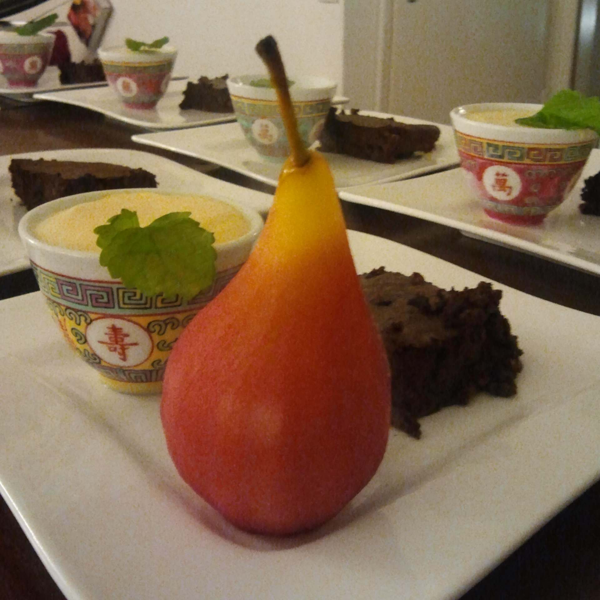 Lust aufs köstlichste Dessert-Trio? Jedes für sich schon eine Versuchung, verschmelzen Schokoladenkuchen, Rotweinbirne und Vanille-Parfait zur sündigen Fantasie aller Nachtisch-Liebhaber. Très delicieux!